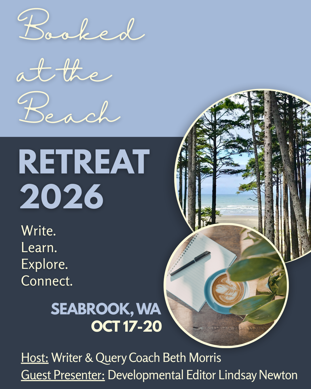 Booked at the Beach is a small women’s writing retreat designed to foster connection, inspire creativity, and provide valuable insight and support to help further your writing and publishing goals. All set against the backdrop of serene Seabrook, WA, where the ocean meets the evergreens.